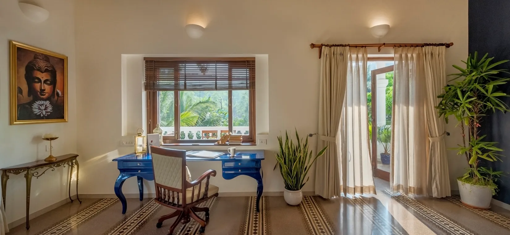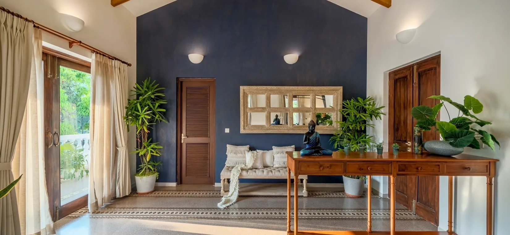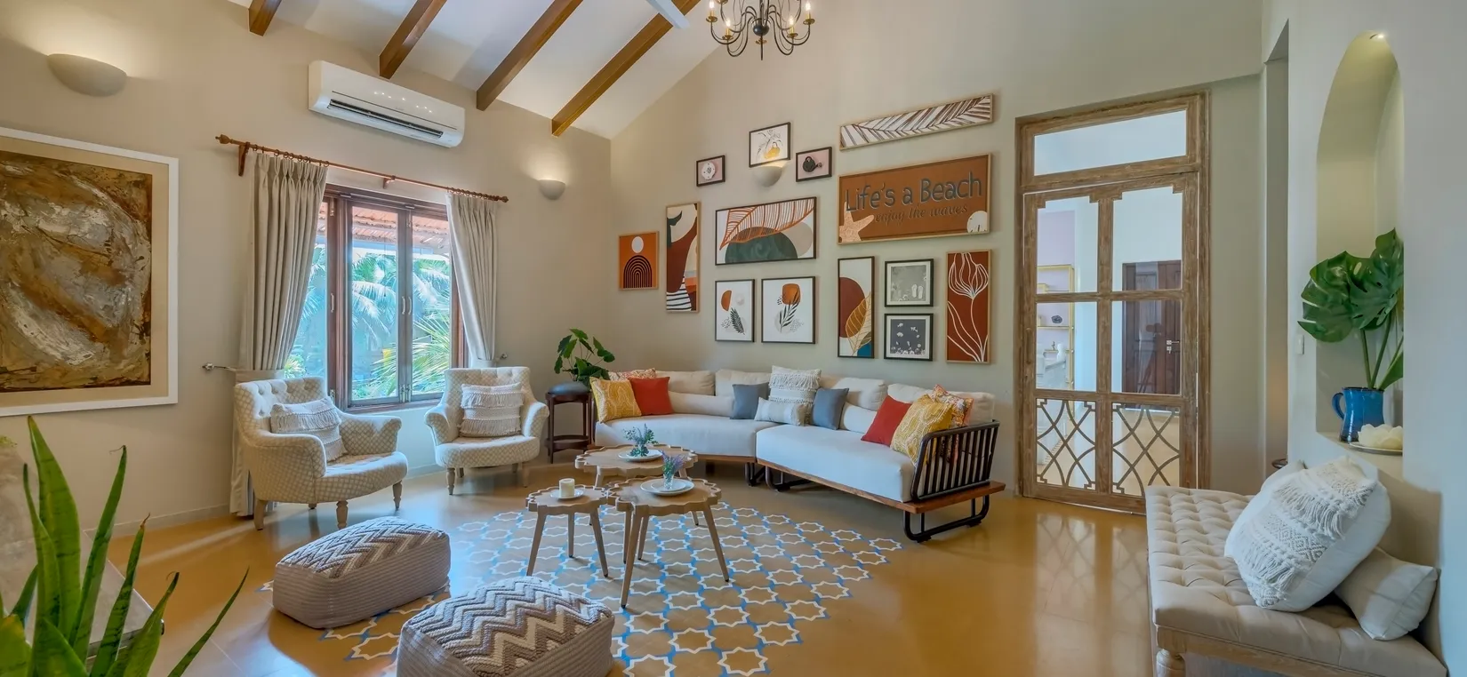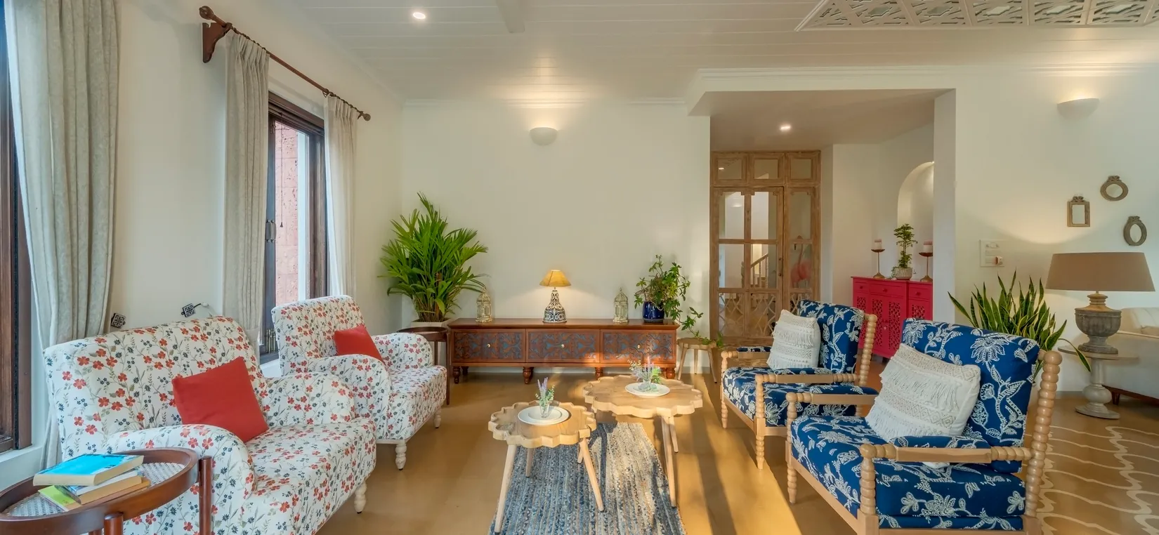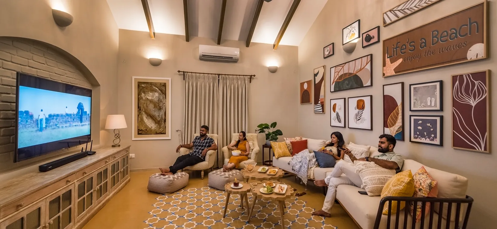 Designed with a blend of soothing palettes, playful accents, and coastal-inspired murals, every corner of this home reflects Goa’s relaxed yet luxurious vibe. The living spaces are airy and bright, with floor-to-ceiling windows that fill the interiors with natural light.
