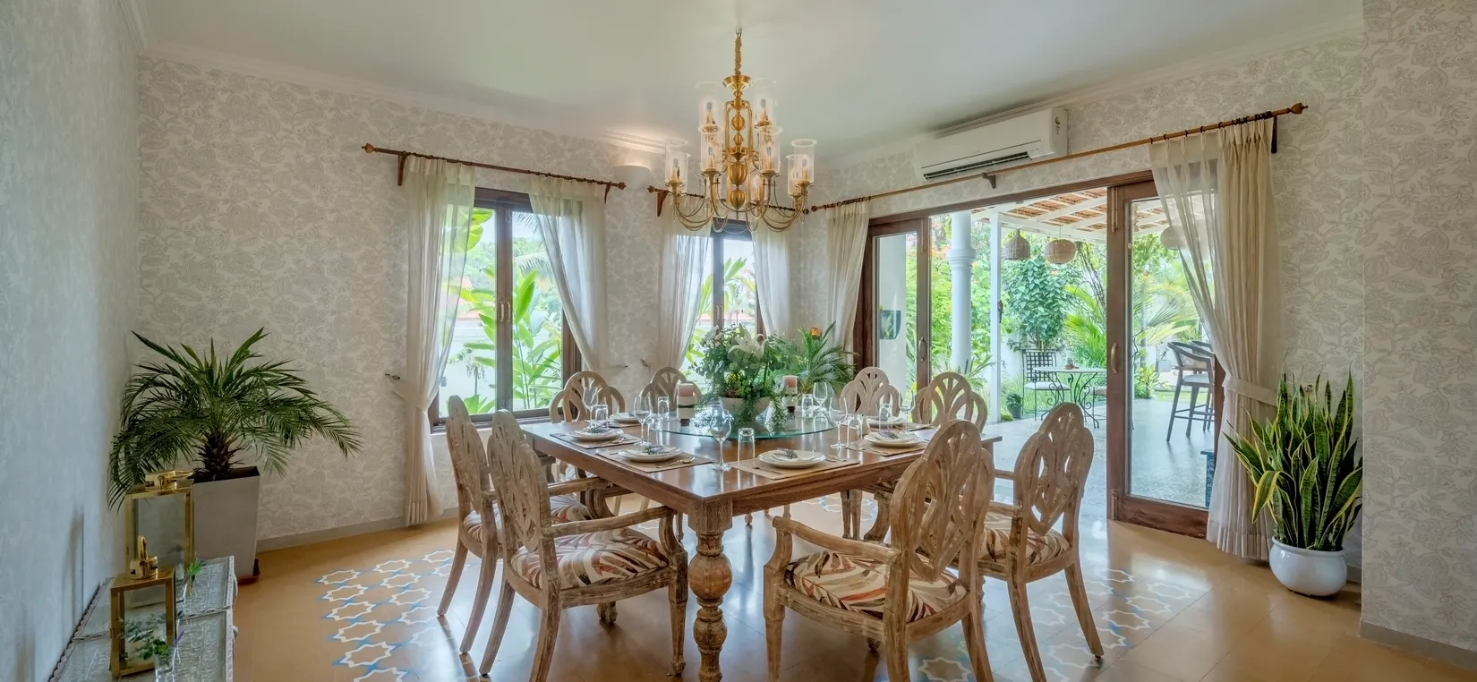The outdoor area is the highlight of Sweet Mango. The sparkling swimming pool is surrounded by swaying palms and lush tropical greenery, creating a private oasis for sunbathing, reading, or simply unwinding. Enjoy your evening tea on the patio, sip a mocktail at the outdoor bar, or relax beneath the poolside gazebo.