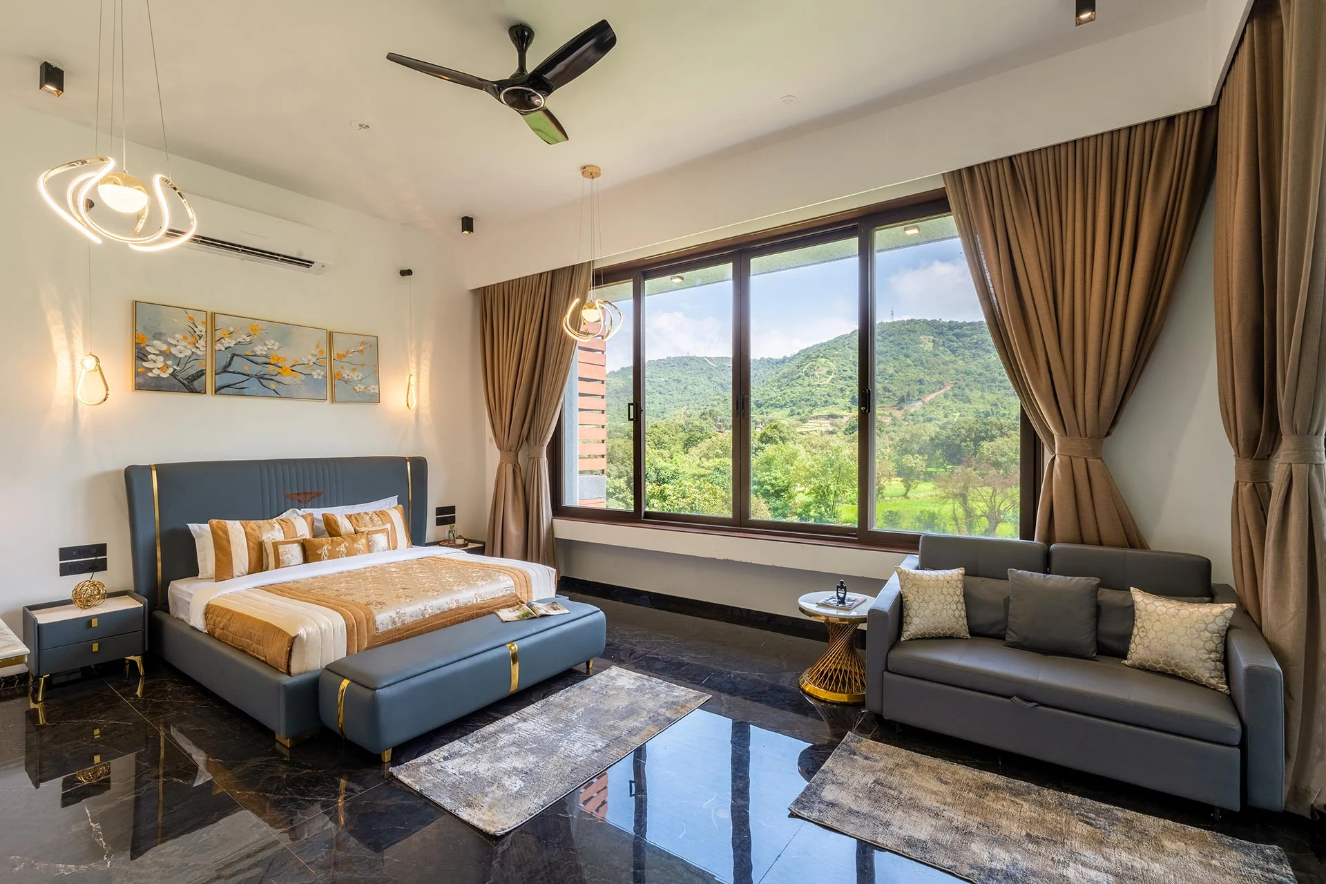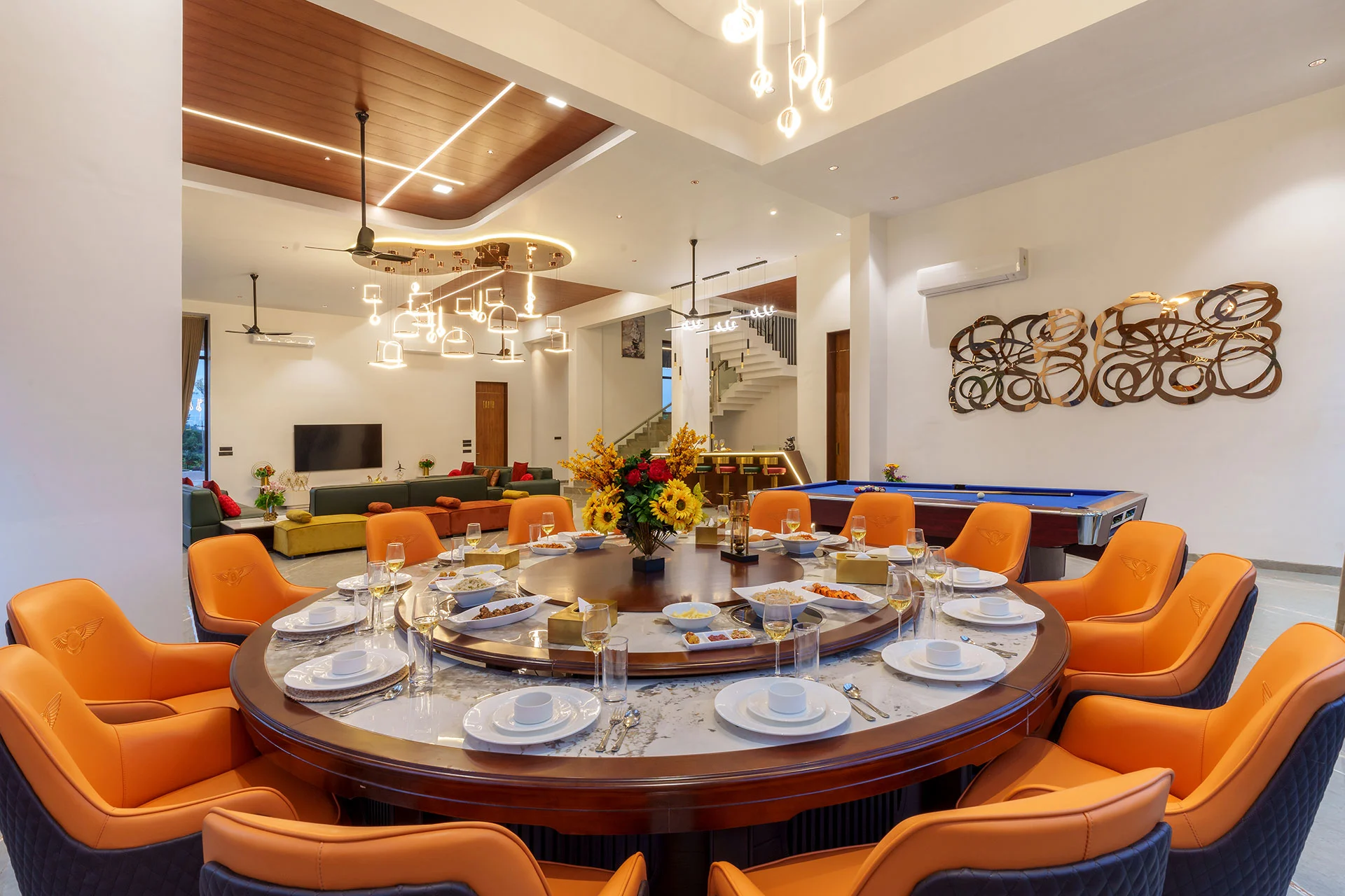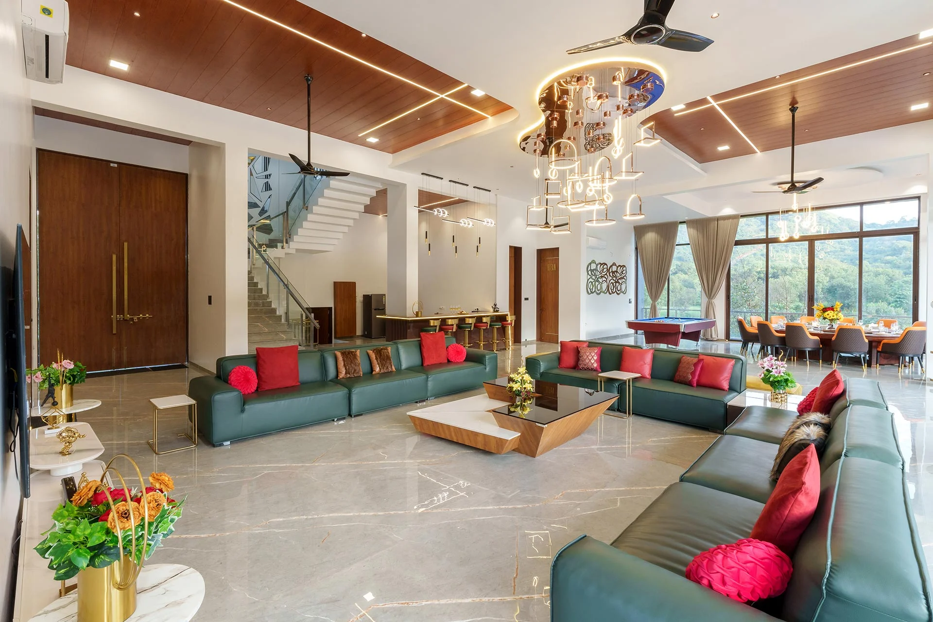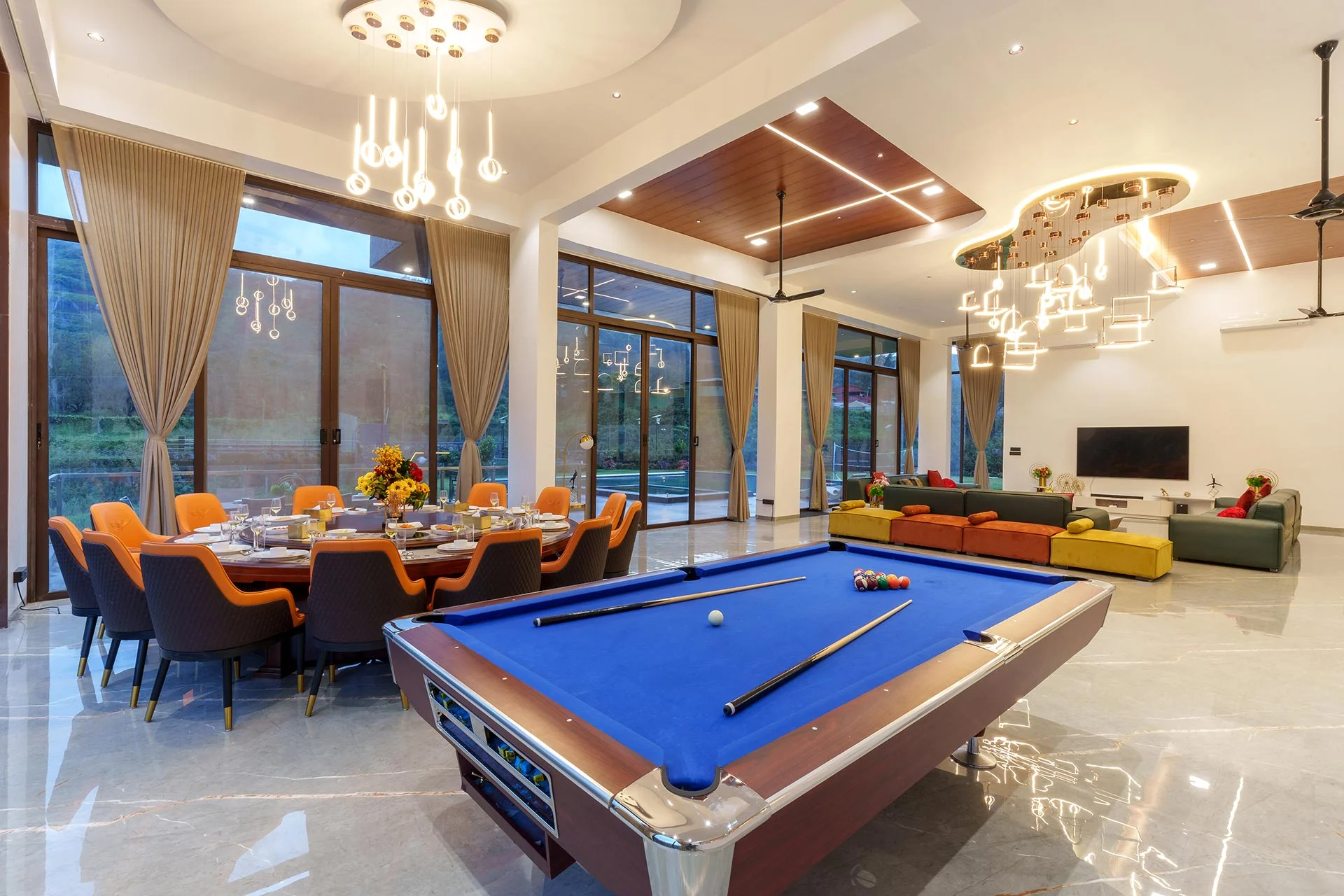 The villa has a range of outdoor games for those with a competitive nature; lawn tennis, badminton, and volleyball are waiting for your energetic side. Head to one of the twelve opulent bedrooms as the sun sets and soak in the opulent bathtubs. But if your adventurous soul craves more, Lonavala’s charming attractions are just a short drive away, promising an enchanting blend of exploration and relaxation.