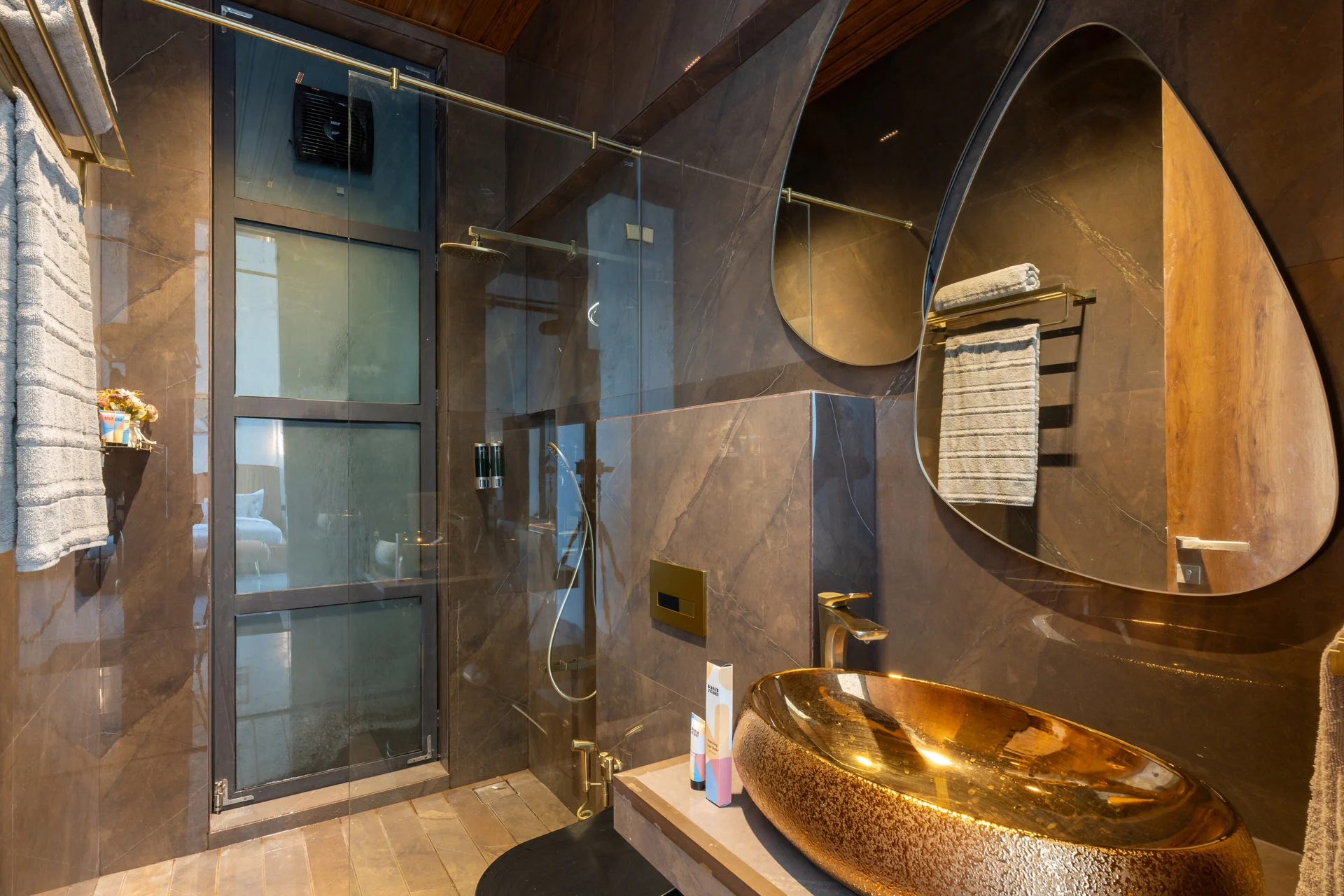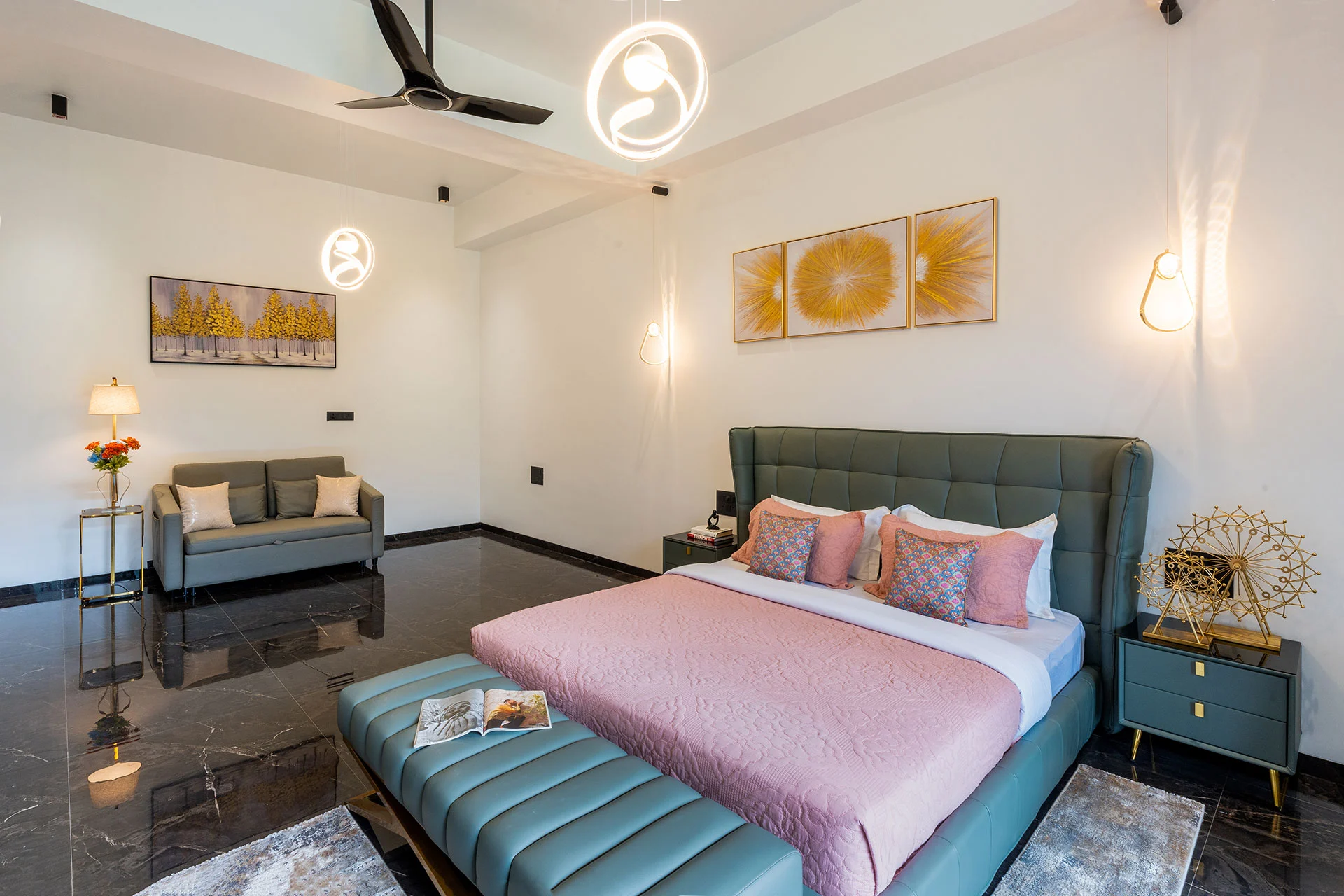 Imagine waking up at The Glen, where your day begins in the grandiose living room, perfect for a leisurely breakfast amidst elegant surroundings. Step out onto the sprawling lawn, where you can bask in the morning sun or dive into the massive pool, complete with a dedicated kids’ area and a bubbling jacuzzi. Enjoy the peaceful ambiance of nature while strolling along the charming trails, accompanied by the