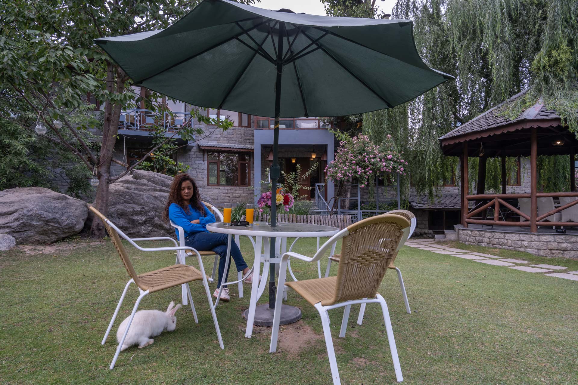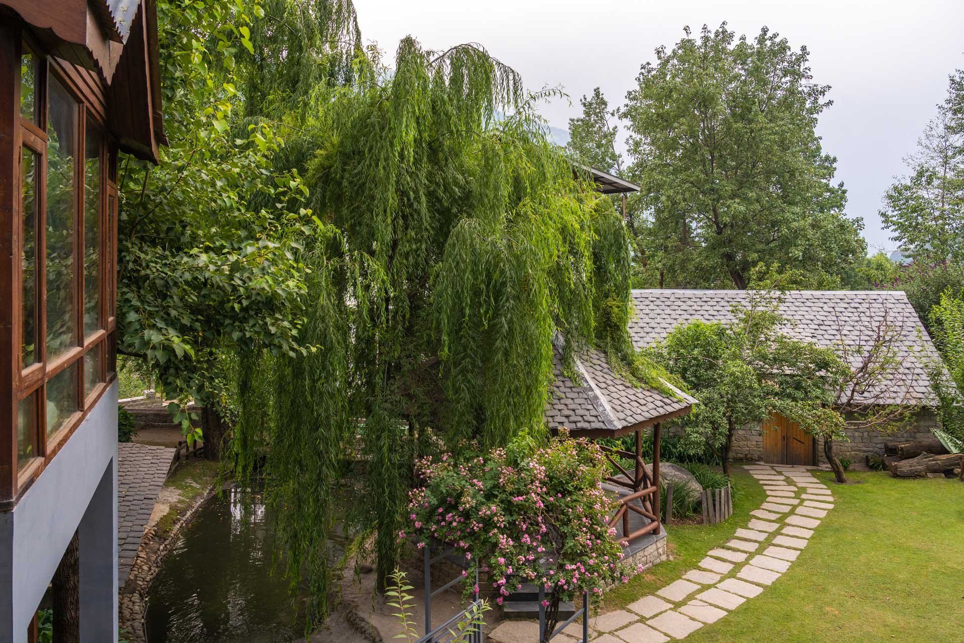The WaterWillow is a transcendent green haven, punctuated with uninterrupted mountainscapes of the Dhauladhar Mountain Range, the Pir Panjal Peak and the city of Manali. Nestled in a quaint nook of the snow-covered Manali, this cosy home is a lovely piece of heaven. One enters this enchanting escape as if walking through a wood and emerald oasis, with rabbits hopping aimlessly in the gardens, apricot, cherry, apple and kiwi creepers adorning the lawns, and the therapeutic humming of the gentle stream that follows you throughout. Mirroring the soothing aura, the indoor spaces are carefully designed and furnished in a calming palette of whites and browns.
