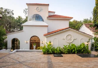 Escape to modern luxury in Goa. Nestled amid quaint homes and lush greenery in Siolim, Villa Maraville is a vision in white. Reminiscent of traditional Goan homes, the Isprava-built villa makes for a luxurious tropical getaway. The 4 bedrooms with ensuite bathrooms use pastels, wood and earthy tones echoing the effortlessness of a Goa holiday.