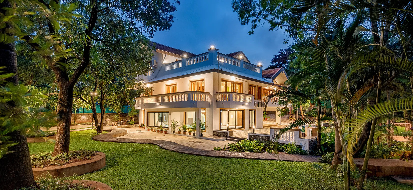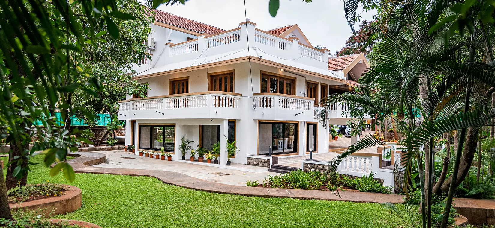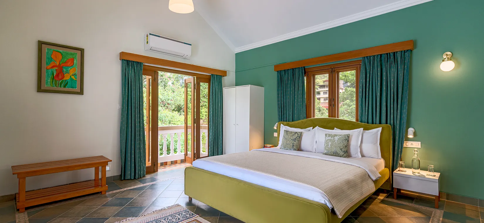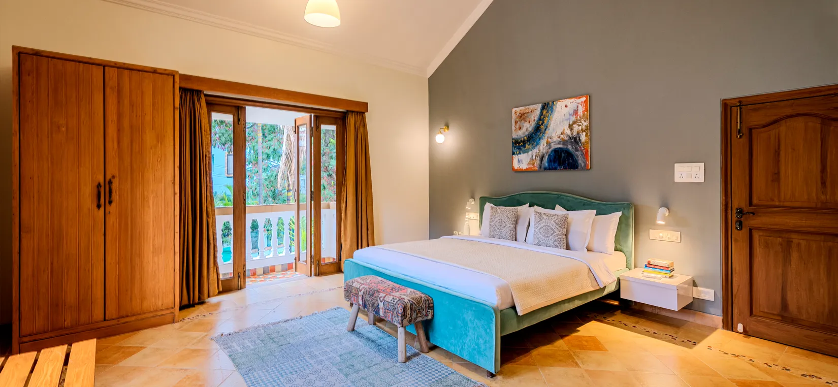 - This luxurious vacation villa is tastefully designed with artistic interiors and contemporary French windows aligning with the walls. The villa overlooks the surrounding greenery and mango trees that are planted on the estate.
