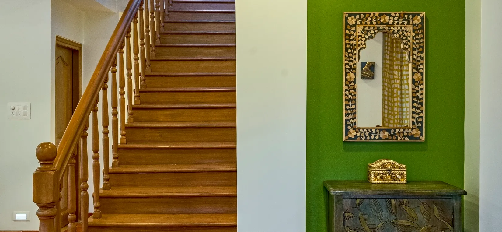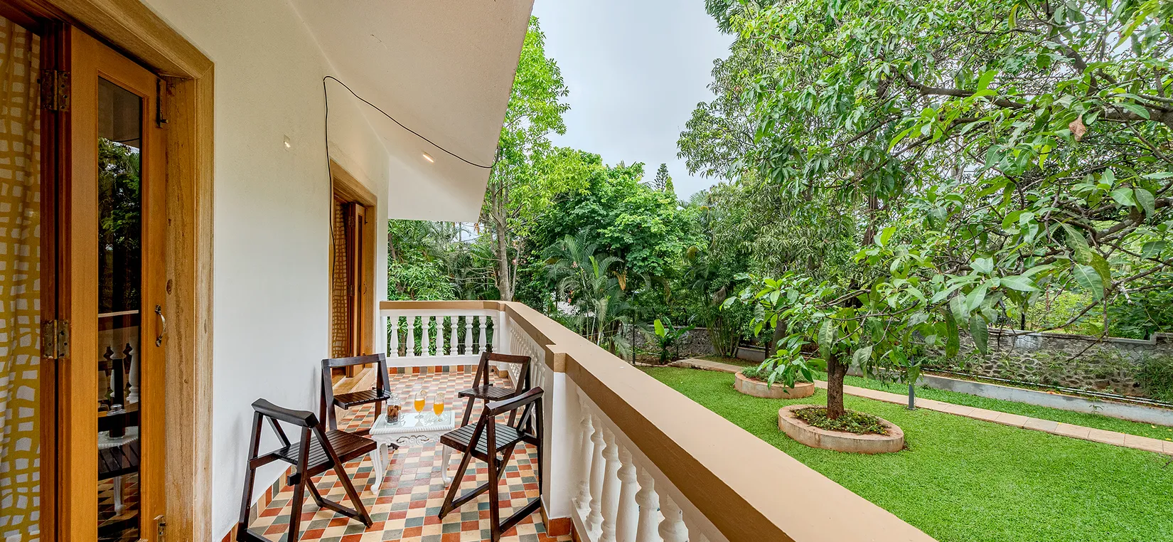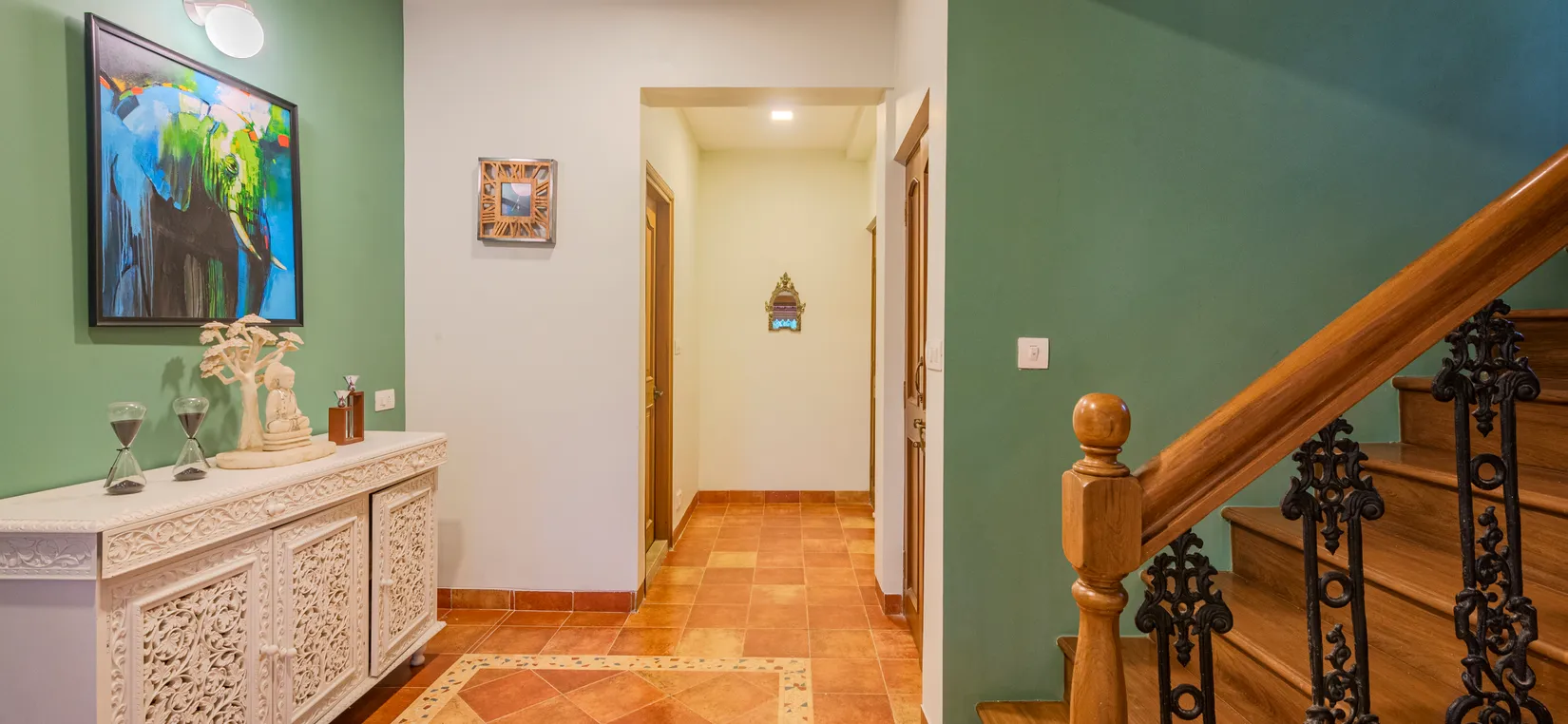 - The living room leads to a vast verandah with a sitout and two staircases – one to a terrace and the other to 3 bedrooms (with ensuite bathrooms) on the first floor. One of these bedrooms has a balcony with stunning views of the sunrise and mango trees within the premises.
