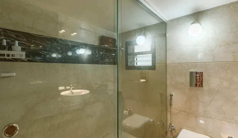 - On the ground floor, you will find a rustic dining area, a spacious balcony with a swing, a powder room, a kitchen, and two bedrooms with ensuite bathrooms.